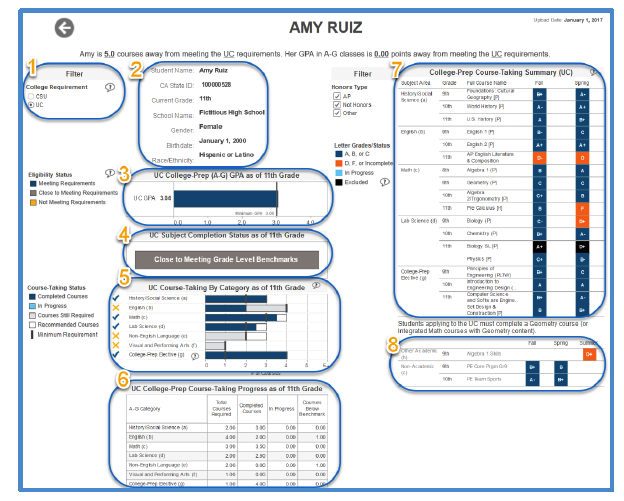 The Student Report provides an in-depth view of student performance and UC and CSU eligibility. The report covers GPA, performance against A-G requirements and individual course grades.